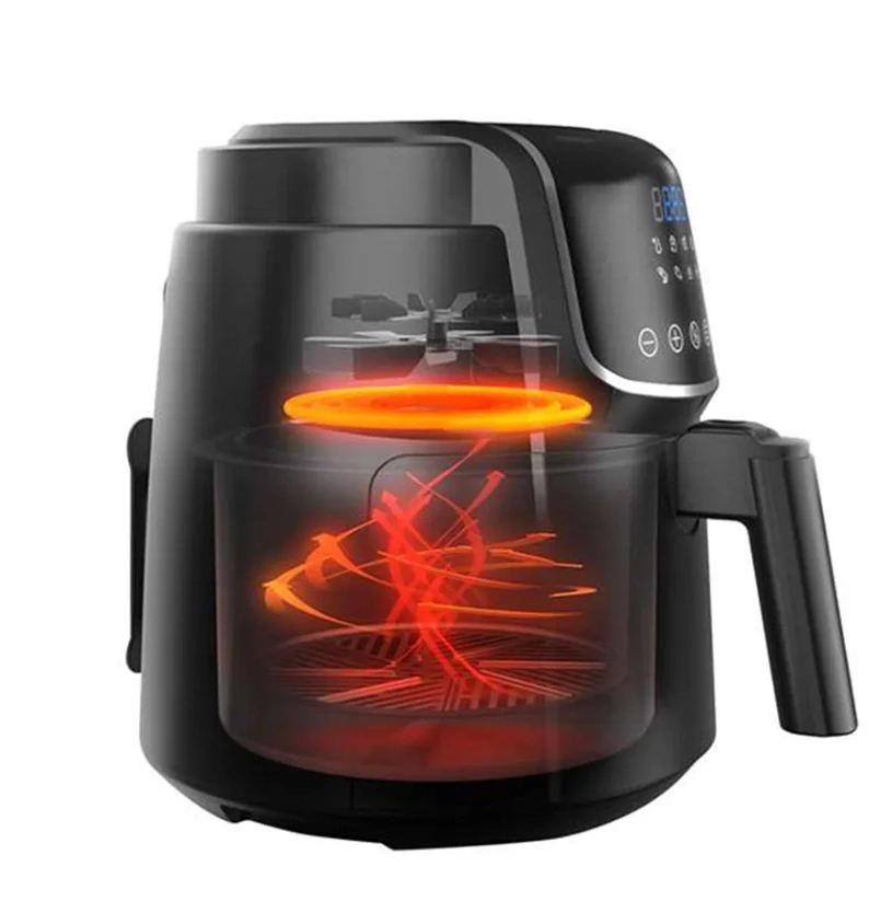 Moderno y compacto, con acabado negro brillante, panel digital táctil y canasta desmontable con recubrimiento antiadherente.