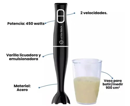 Equipada con dos niveles de velocidad, varilla emulsionadora de acero y un vaso medidor de 900 cm³, esta licuadora manual se adapta a múltiples preparaciones como salsas, cremas, smoothies y emulsiones. Su estructura resistente y su sistema de acople seguro aseguran un funcionamiento estable, convirtiéndola en una opción confiable para quienes buscan practicidad y precisión en cada receta.