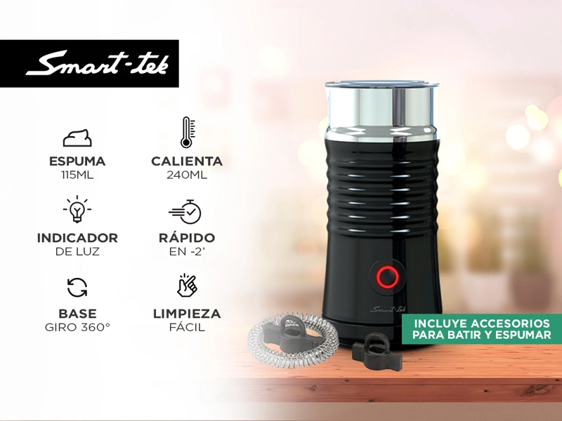 Este espumador Smart-tek combina capacidad, rapidez y facilidad de uso. Espuma hasta 115 ml o calienta 240 ml de leche en solo segundos. Cuenta con base giratoria 360°, indicador de luz, accesorios intercambiables y un diseño que permite una limpieza rápida. Todo lo que necesitás para elevar tus bebidas al siguiente nivel.